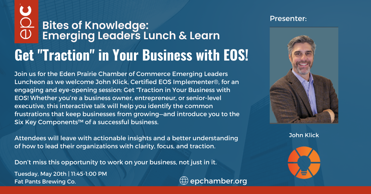 Join us for the Eden Prairie Chamber of Commerce Emerging Leaders Luncheon as we welcome John Klick, Certified EOS Implementer®, for an engaging and eye-opening session: Get “Traction in Your Business with EOS! Whether you’re a business owner, entrepreneur, or senior-level executive, this interactive talk will help you identify the common frustrations that keep businesses from growing—and introduce you to the Six Key Components™ of a successful business.