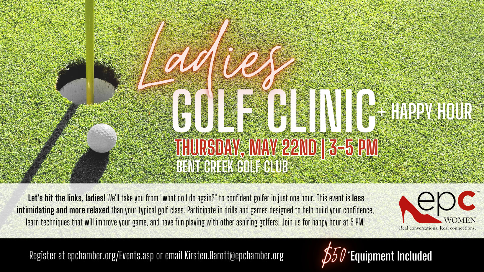Let's hit the links, ladies! We'll take you from "what do I do again?" to confident golfer in just one hour. This event is less intimidating and more relaxed than your typical golf class. Participate in drills and games designed to help build your confidence, learn techniques that will improve your game, and have fun playing with other aspiring golfers! Join us for happy hour!
