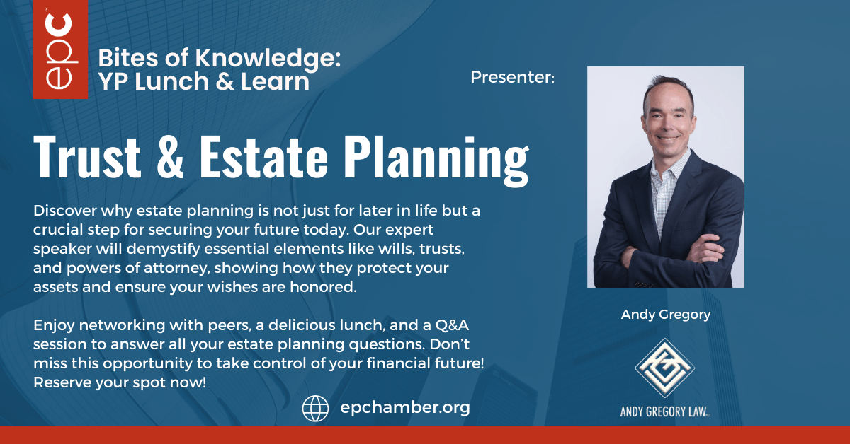 "Estate Planning for Young Professionals." Discover why estate planning is not just for later in life but a crucial step for securing your future today. Our expert speaker will demystify essential elements like wills, trusts, and powers of attorney, showing how they protect your assets and ensure your wishes are honored. Enjoy networking with peers, a delicious lunch, and a Q&A session to answer all your estate planning questions. Don’t miss this opportunity to take control of your financial future! Reserve your spot now!