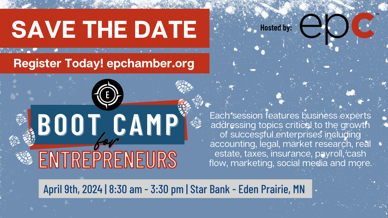 Join the Eden Prairie Chamber of Commerce on April 9th for this daylong, fully packed training event – Boot Camp for Entrepreneurs! Being an entrepreneur requires the knowledge of a vast array of areas to begin and to be successful.