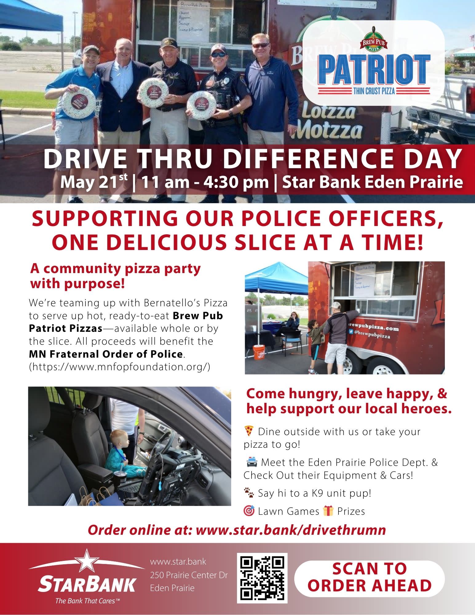 Bernatello’s Pizza and the Eden Prairie Police department are teaming with the EP Chamber of Commerce and Star Bank to raise money for the MN FOP (Fraternal Order of Police) by hosting a community pizza party on May 21st.