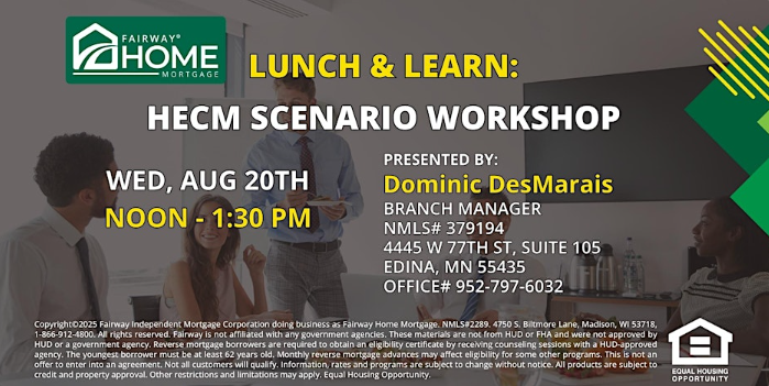 Please join Dominic DesMarais with Fairway Home Mortgage for an advanced training on the HECM (Home Equity Conversion Mortgage) - the only FHA-insured Reverse Mortgage Loan. He'll guide you through various scenarios, providing valuable insight and strategies. Bring any potential client scenarios with you to discuss! Don’t miss this interactive session where you'll have the chance to ask questions and walk away with practical tools you can use right away!