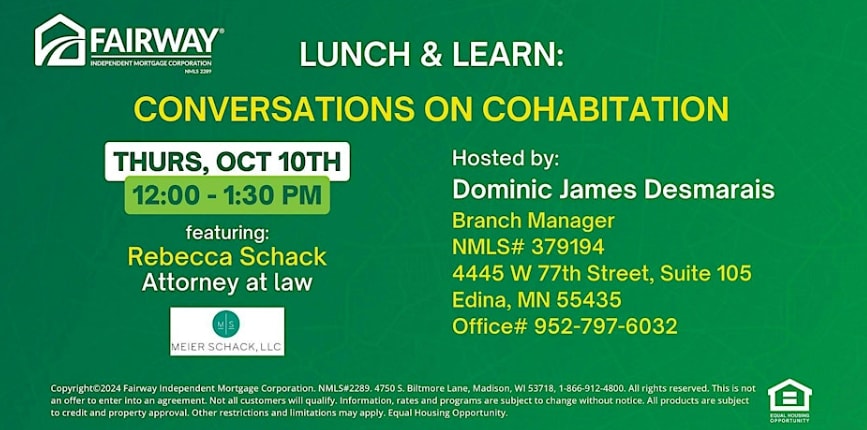 Please join Dominic James DesMarais with Fairway Independent Mortgage Corporation and Rebecca Schack, attorney at law for a complimentary lunch on Oct 10th at noon. Rebecca will discuss the implications of two (or more) non-married parties owning or purchasing property together. She will highlight the importance of having a formal cohabitation agreement or partnership agreement, and provide the best tips for mitigating future conflict and potential legal fees. You'll also learn how cultural shifts and societal issues are directly affecting home life and the buying process.