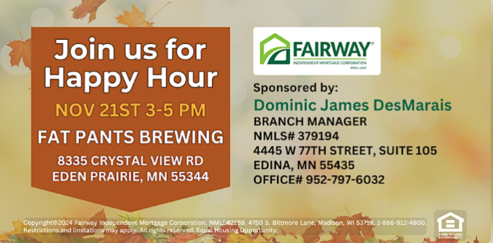 Join Dominic DesMarais with Fairway Independent Mortgage Corporation for his monthly sponsored happy hour on Thurs, Nov 21st! This is a great opportunity to meet new people, expand your network, and unwind after a long day at work. Drinks and appetizers will be provided. This event is free and open to all business professionals. We look forward to seeing you there!