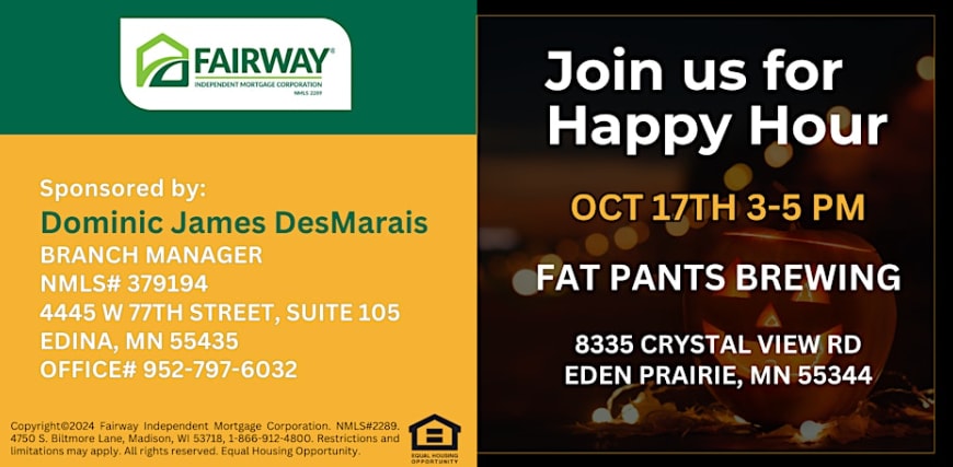 Join Dominic DesMarais with Fairway Independent Mortgage Corporation for his monthly sponsored happy hour on Thurs, Oct 17th! This is a great opportunity to meet new people, expand your network, and unwind after a long day at work.