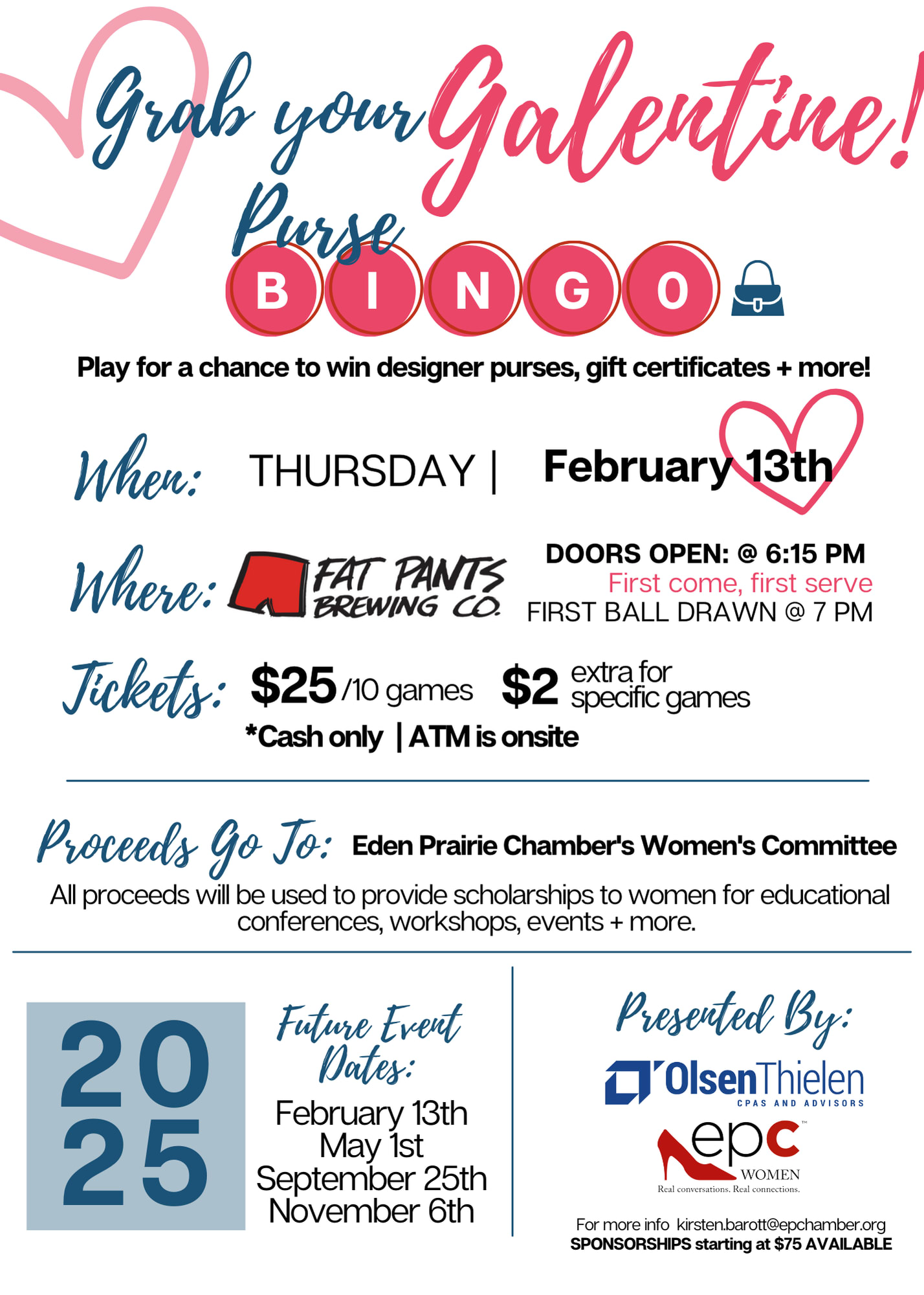 Join us, for your chance to enjoy BINGO, brews and the chance to win a designer purse or cash/prize package!! Meet members of the Eden Prairie Chamber's Women's Committee and support initiatives to host women's-focused programming, trainings, resources and scholarships.