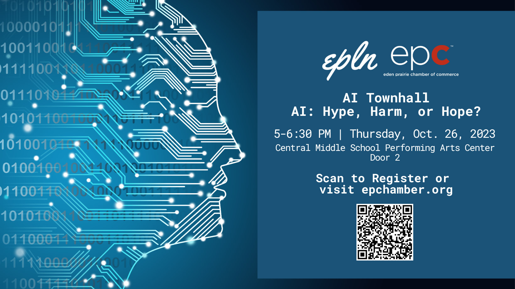 Join hosts, Eden Prairie Local News & the Eden Prairie Chamber of Commerce, for this Artificial Intelligence Town Hall from 5:00 - 6:30 p.m. The event is being held at the Performing Arts Center at Central Middle School located at 8025 School Road (Door 2).