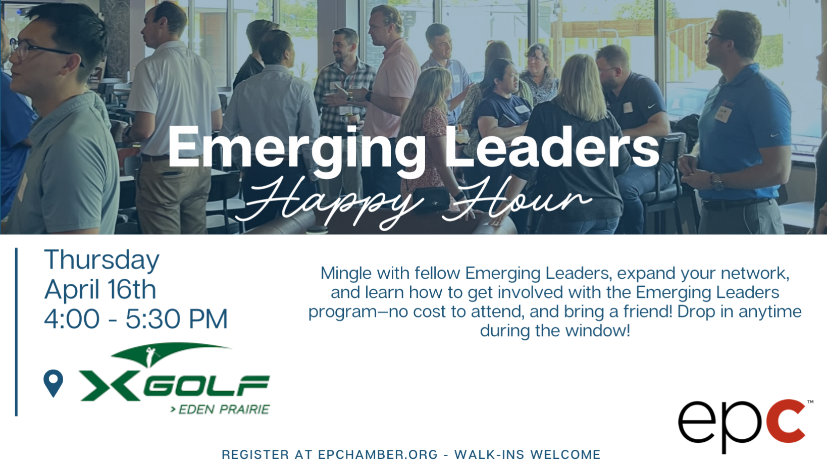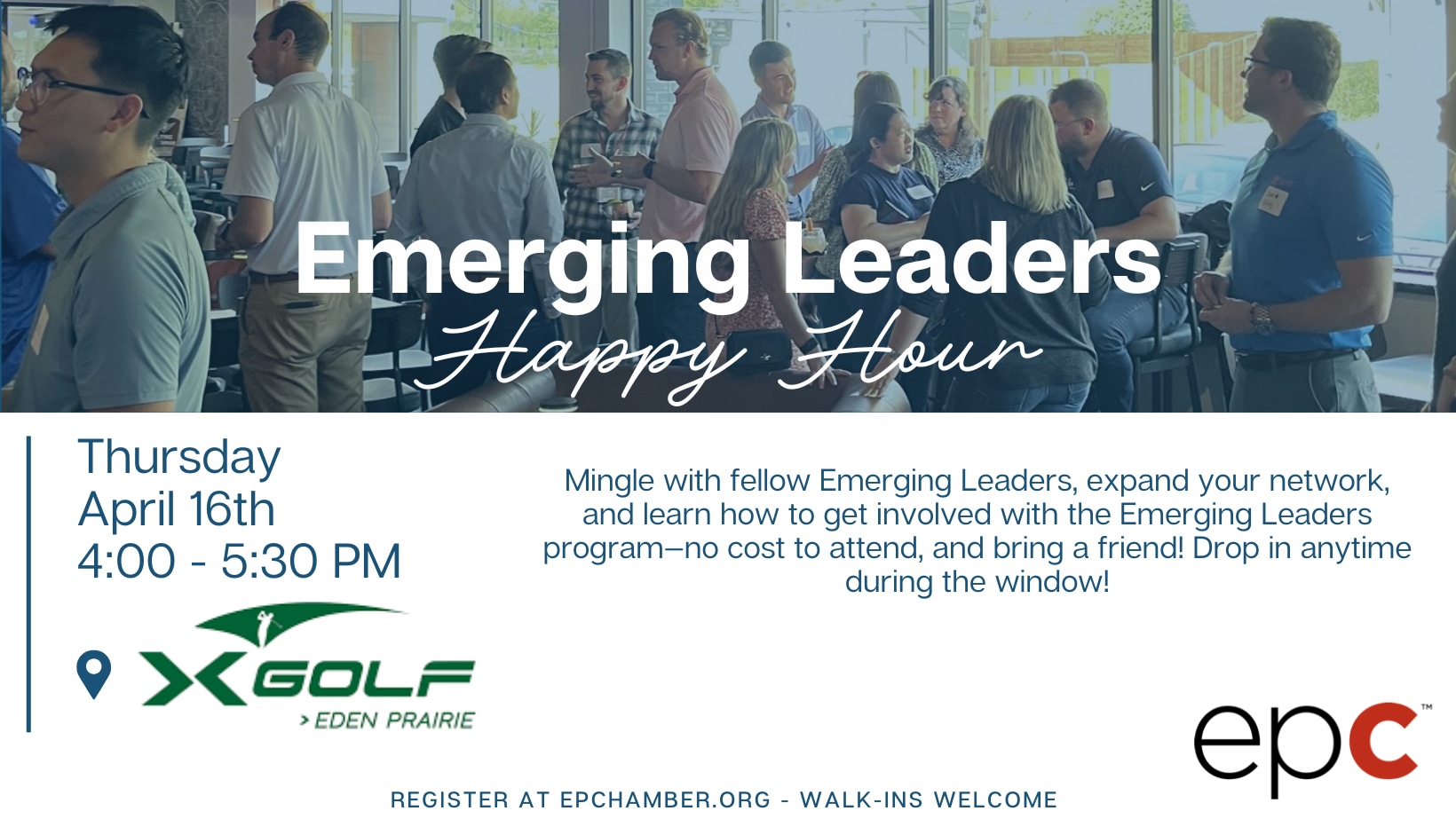 Join us for a casual, open-house style Emerging Leaders Happy Hour on Thursday, April 16th, 2026, from 4:00–5:30 PM at X-Golf Eden Prairie. Connect with fellow Emerging Leaders, expand your network, and learn how to get involved with the program—no cost to attend, and bring a friend. Drop in anytime during the window.