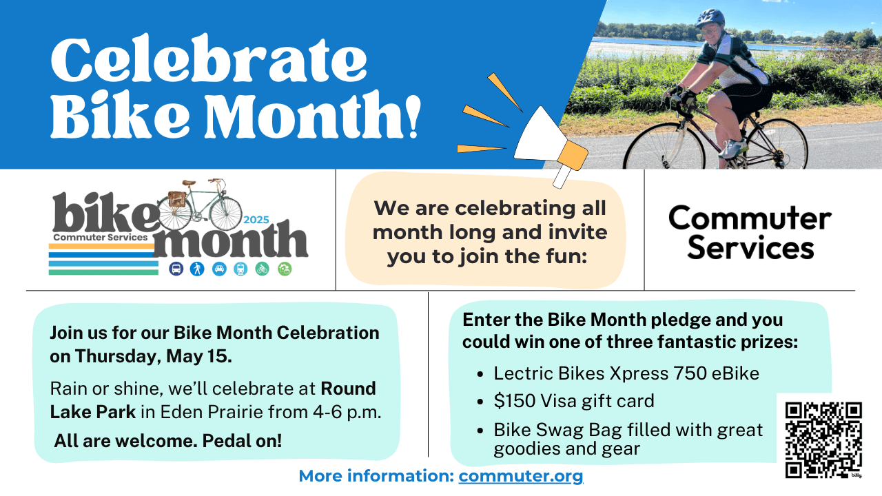 Bike Month Celebration: Rain or shine, celebrate Bike Month 2025 with Commuter Services at Round Lake Park, 16691 Valley View Road, in Eden Prairie on Thursday, May 15, from 4-6 p.m.