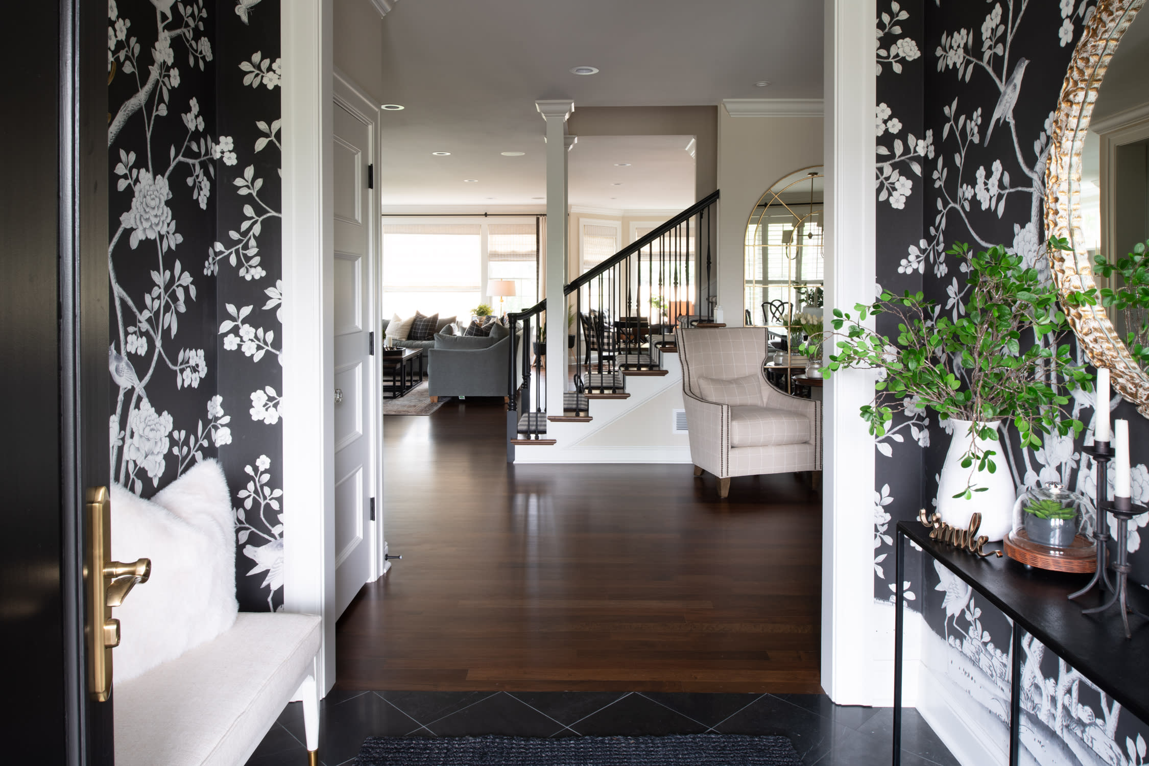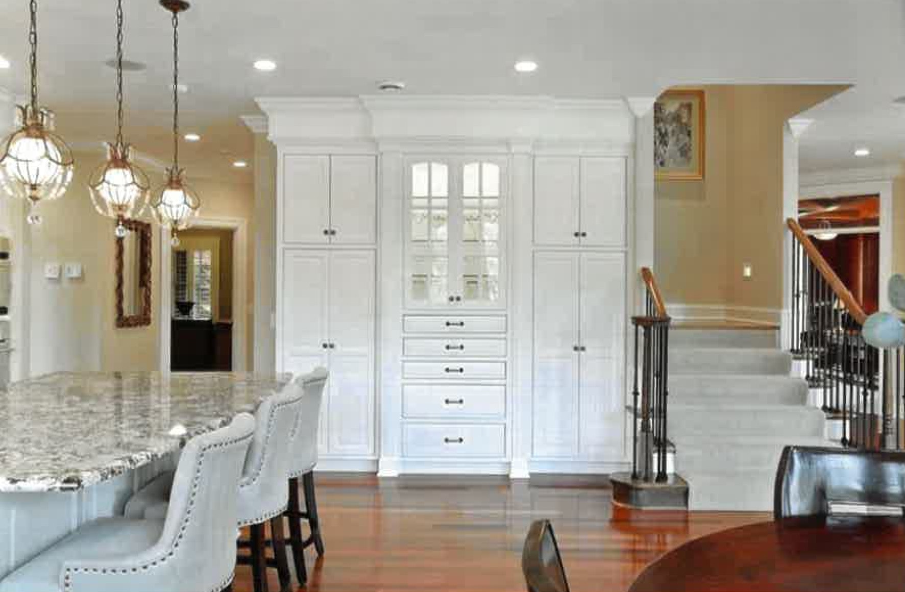 The project awarded was for an entire house remodel in Edina, MN. The clients wanted to make updates to their home originally built in 2005 to make it more modern and elegant. On the main level, an angled stairwell was in the center of the floor plan separating the front foyer from the kitchen. The stairs jutted into the kitchen taking up valuable space. To create a more prominent view from the foyer and provide more cabinetry space in the kitchen, the stairwell was redesigned to eliminate the angle, and modify the structural wall that separated the kitchen and foyer. The ceiling was opened to install structural beams that transferred the load to the basement. This not only provided the look of an open staircase, but also provided an additional 30 square feet to the master closet above.