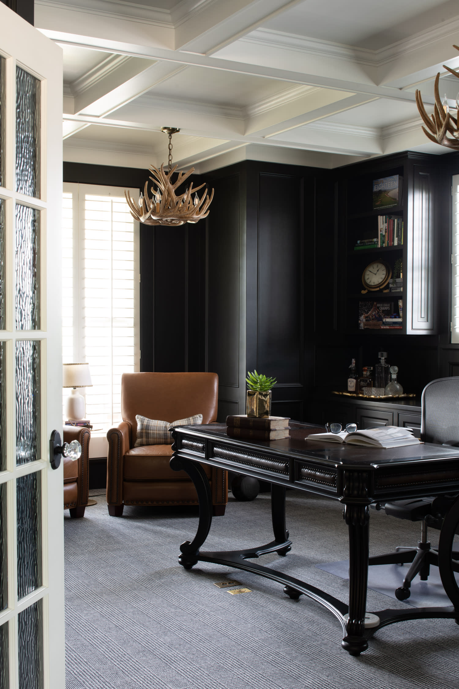 Other details included a complete renovation of the master suite, adding a fireplace in the bedroom, custom built-ins, and building a half wall with glass panels in the bath to create a better distinction between the shower and new soaking tub. A lower-level Scottish pub style bar was renovated into a sleek modern look by painting cabinetry in black enamel and replacing with an open, extended bar. All existing trim in the lower level was painted in black to match.